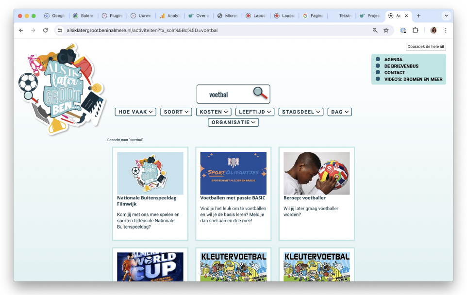 Uitdaging: de vele activiteiten en zoekmogelijkheden (filters) zo gebruiksvriendelijk in beeld te brengen – met name op de mobieltjes – voor de doelgroep: kinderen tot 16 jaar in Almere en hun ouders.